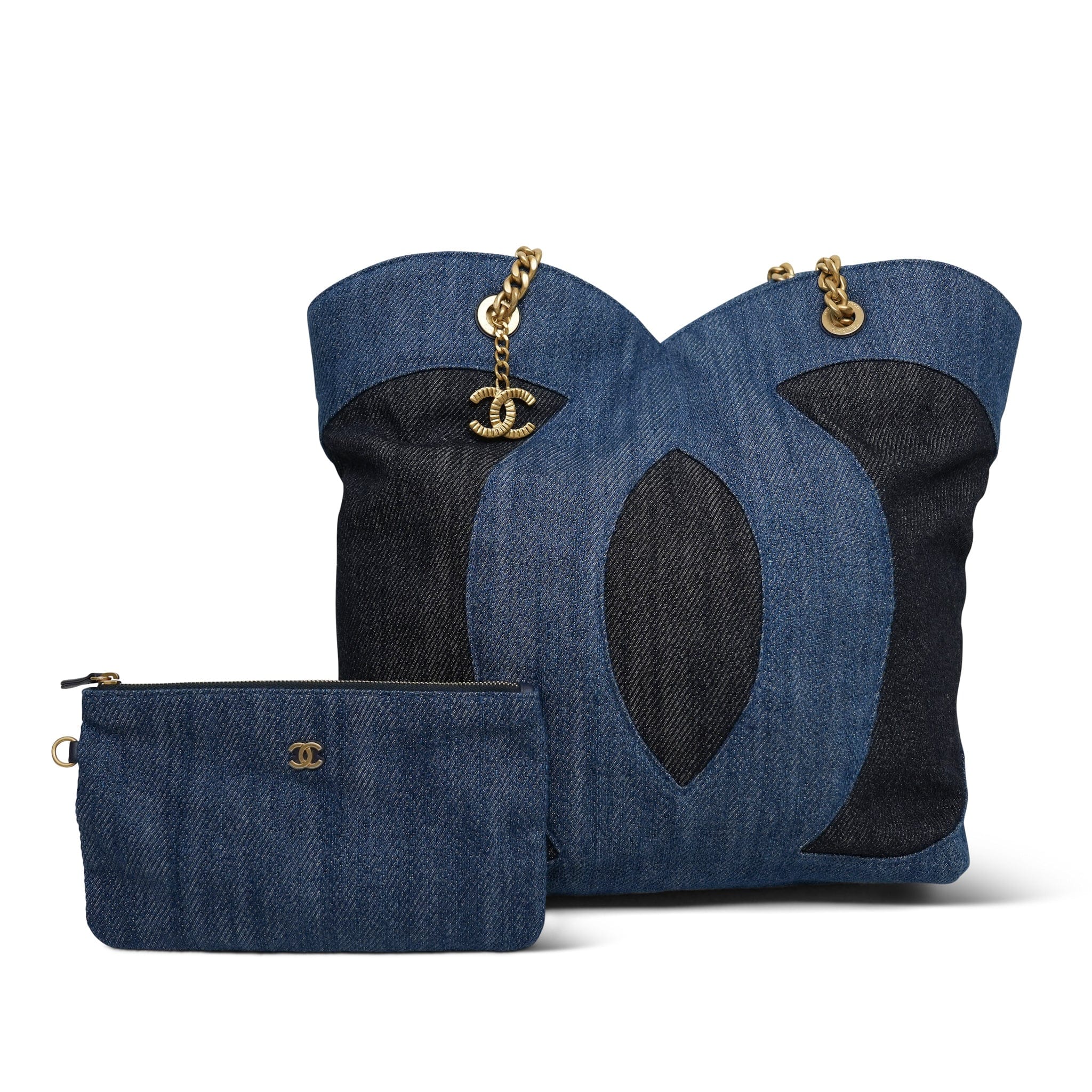 23P Black Blue Denim Quilted CC Tote Aged Gold Hardware
