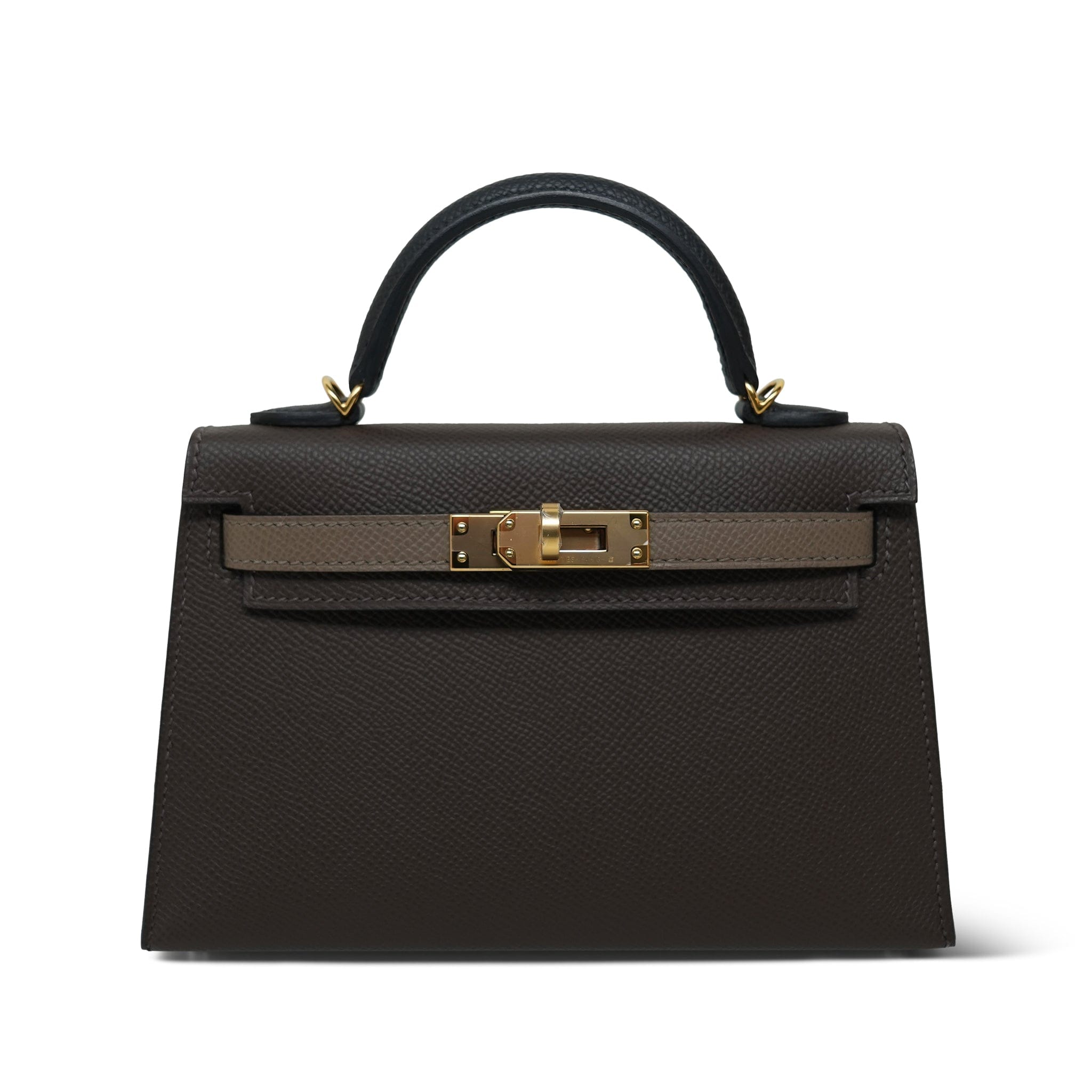 Mini Kelly Sellier Tri-Color Ecorce Etoupe Black Epsom Permabrass Plated B Stamp