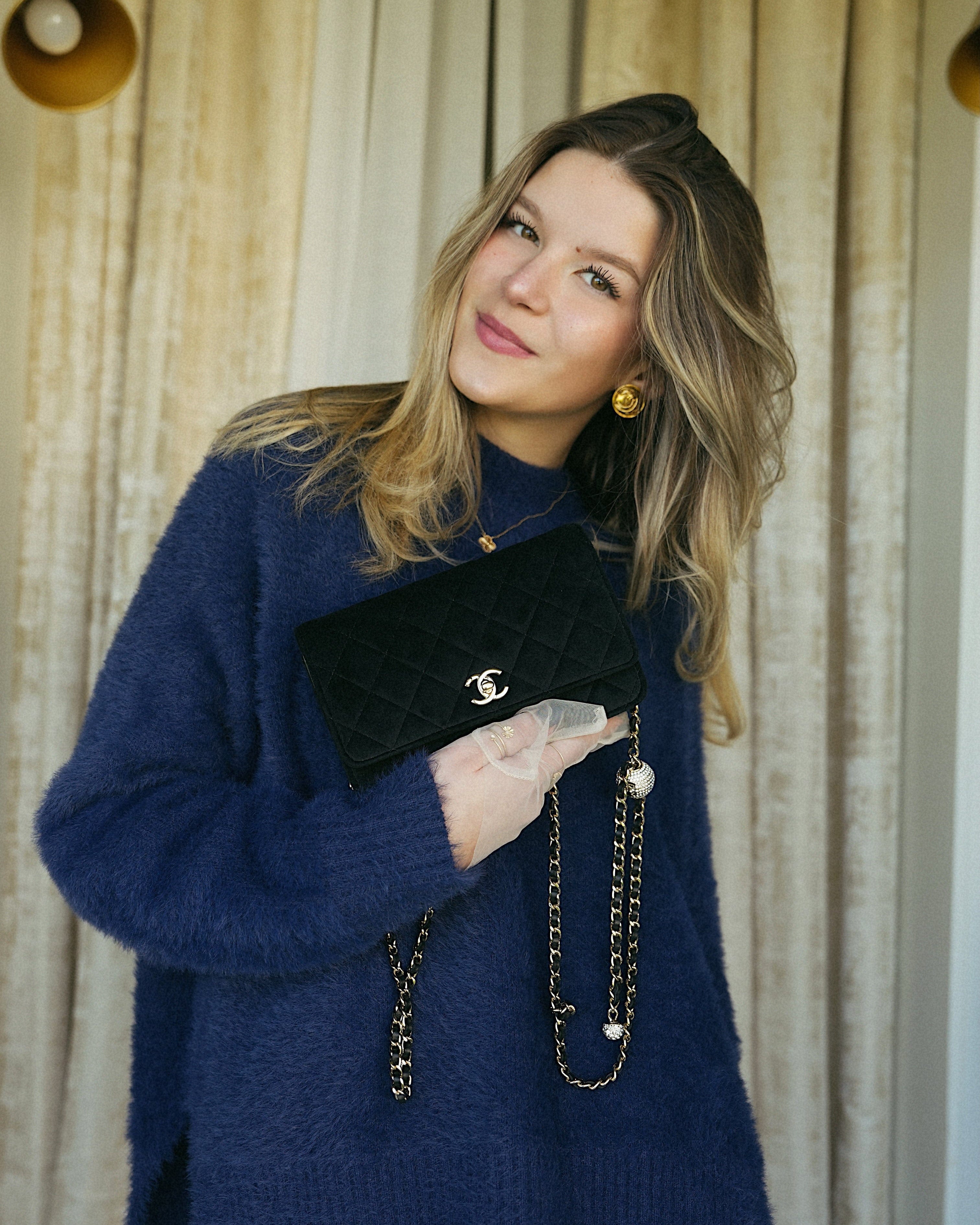 20A Black Velvet Quilted Crystal Pearl Crush Wallet On Chain WOC Light Gold Hardware