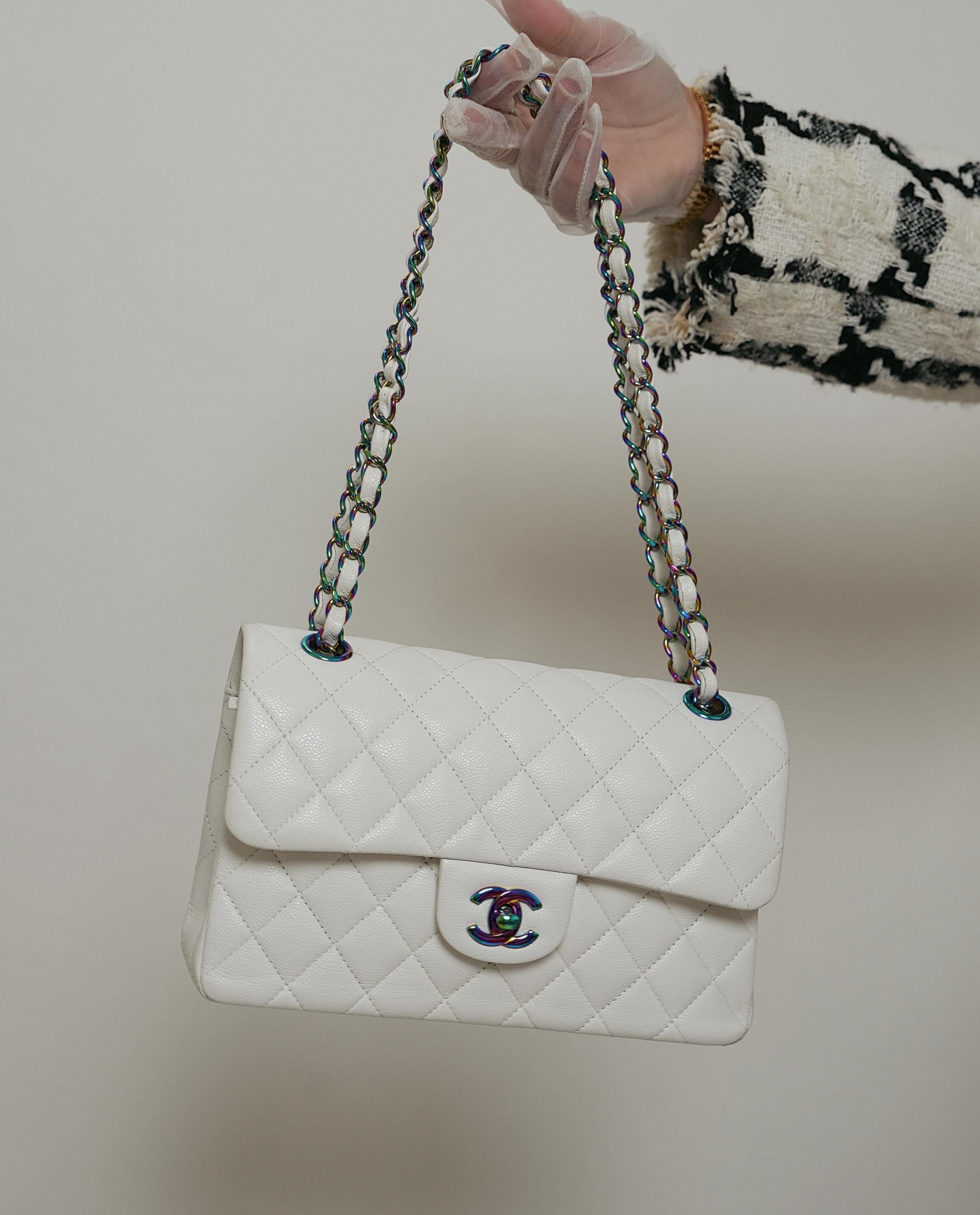 White Caviar Quilted Classic Flap Small Rainbow Hardware