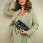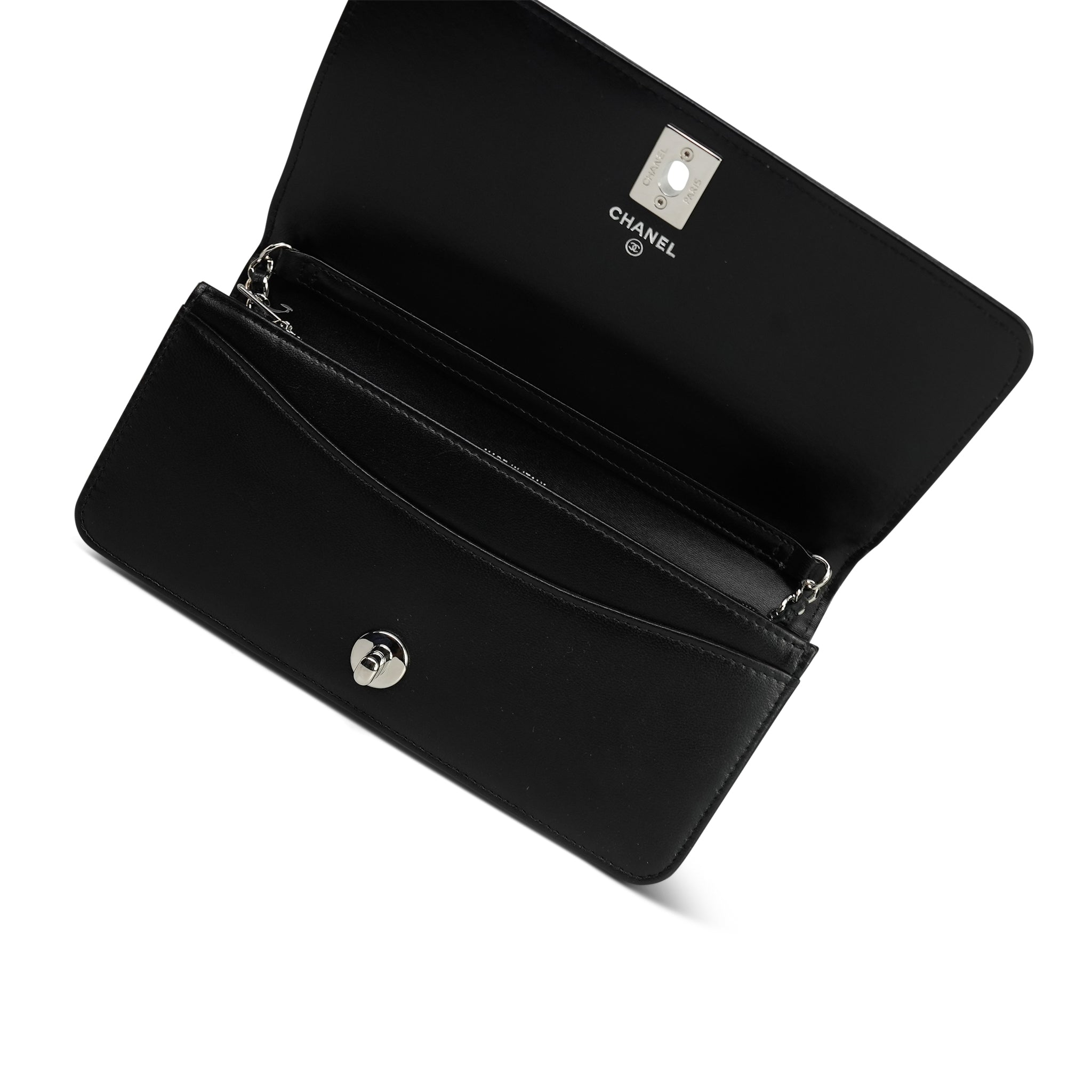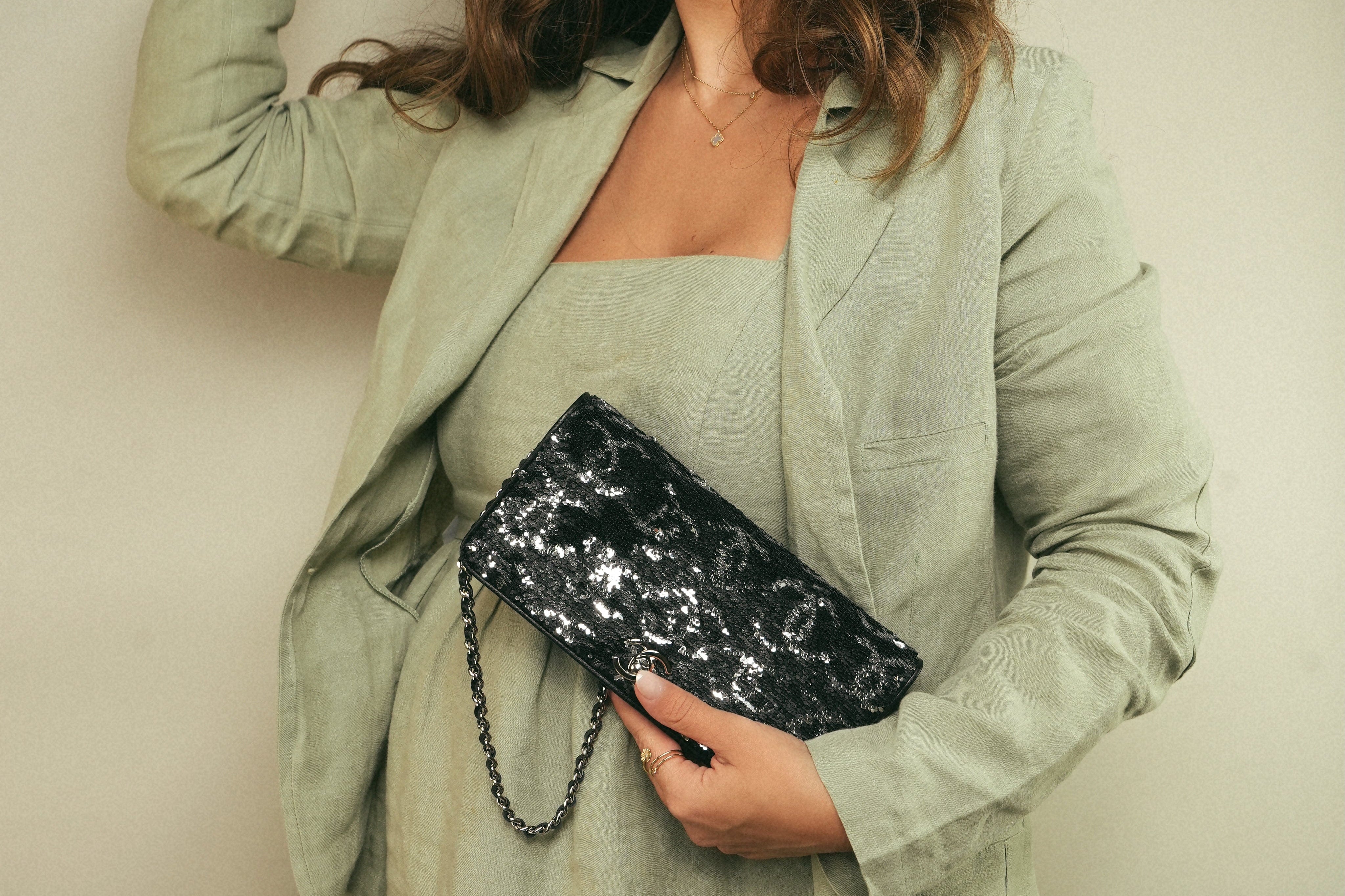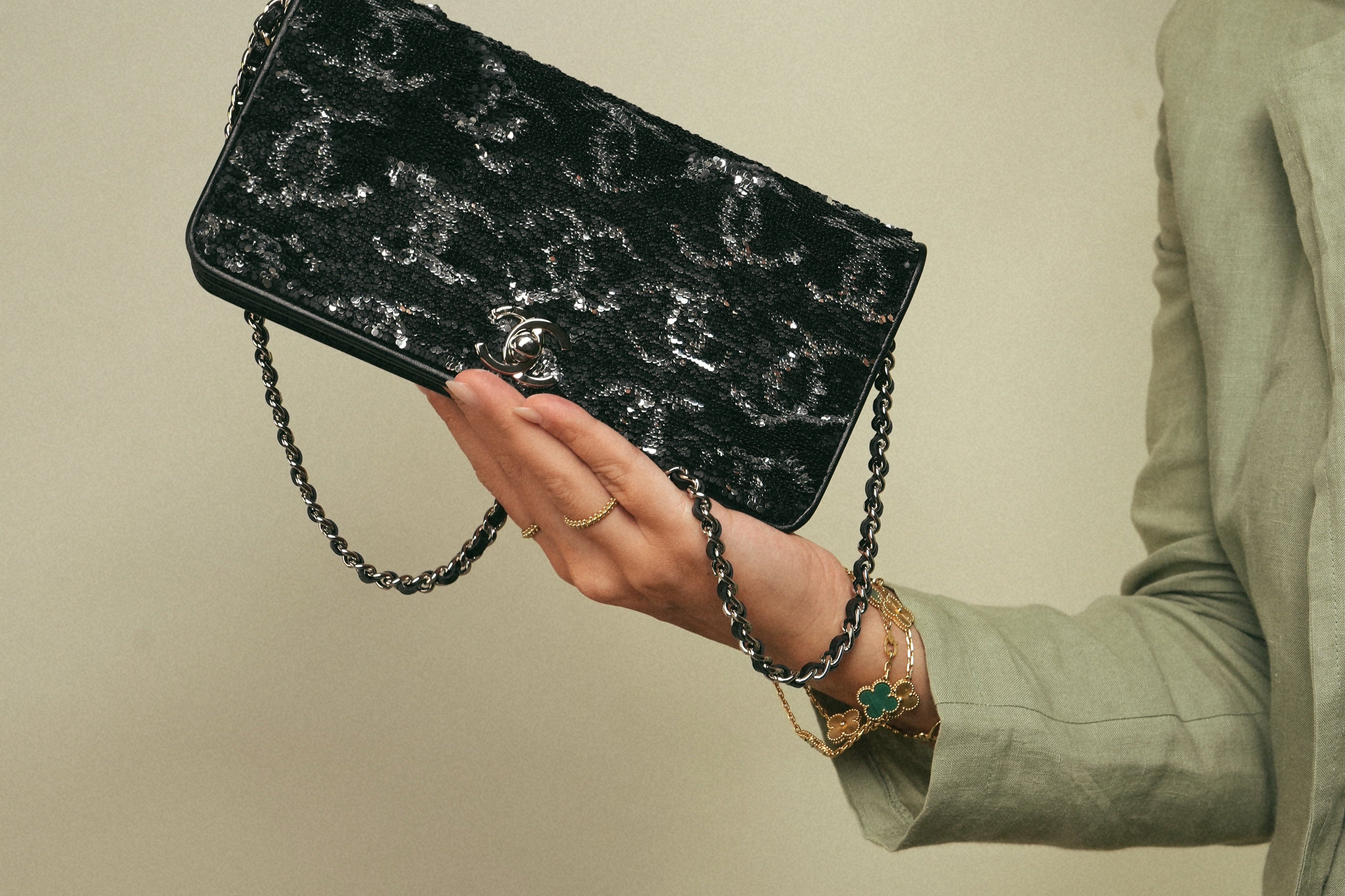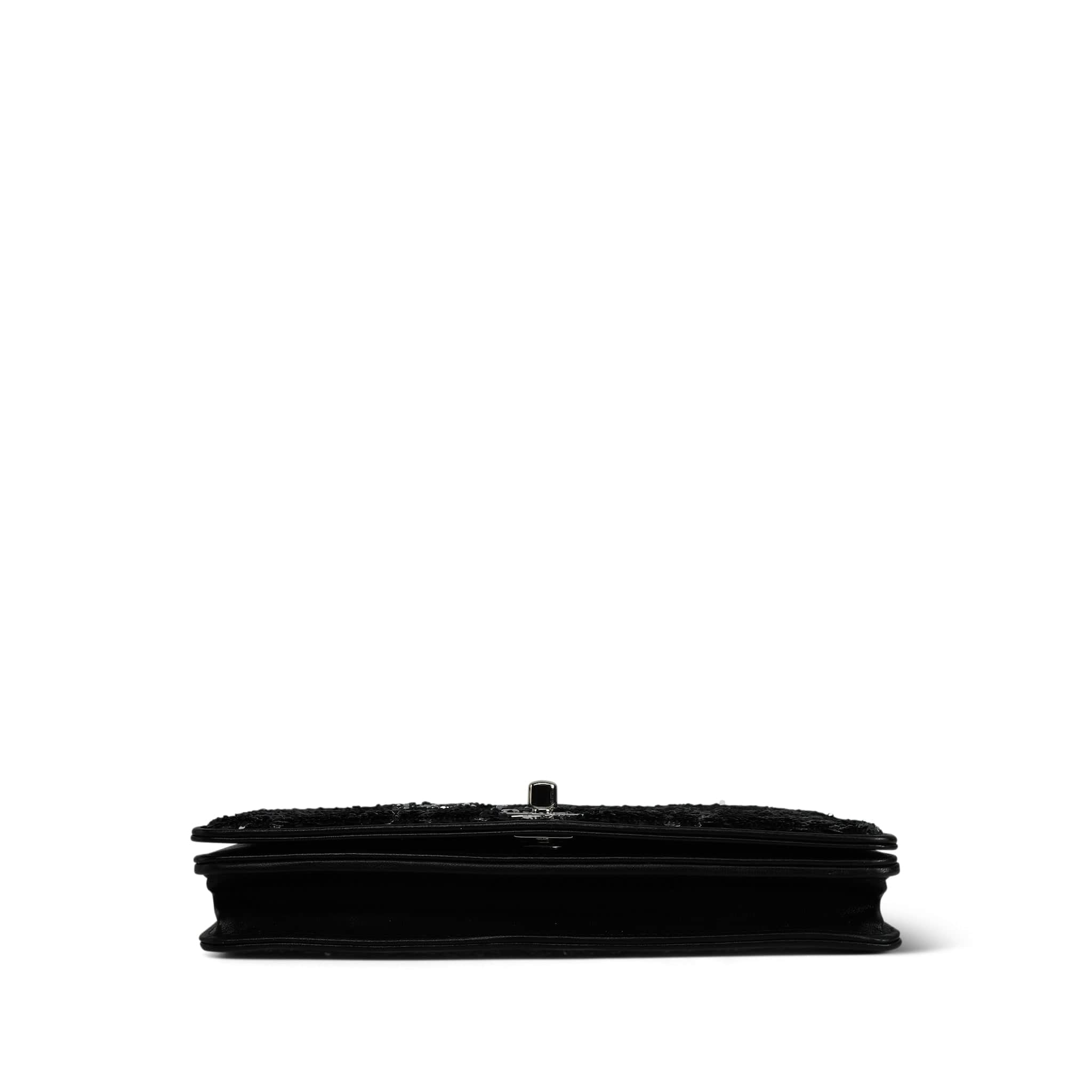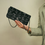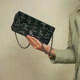 23B Black Silver CC Logo Sequin Clutch On Chain Silver Hardware