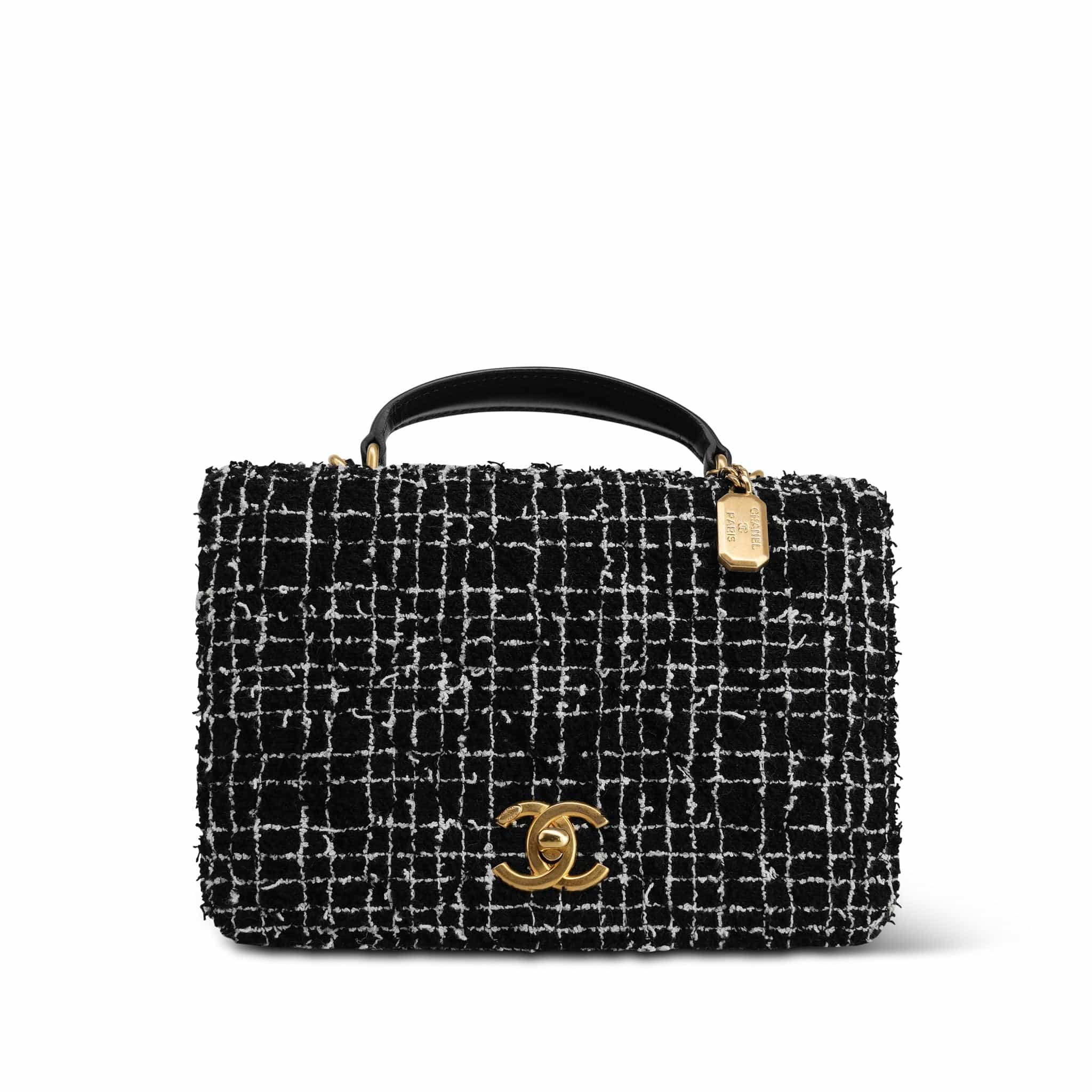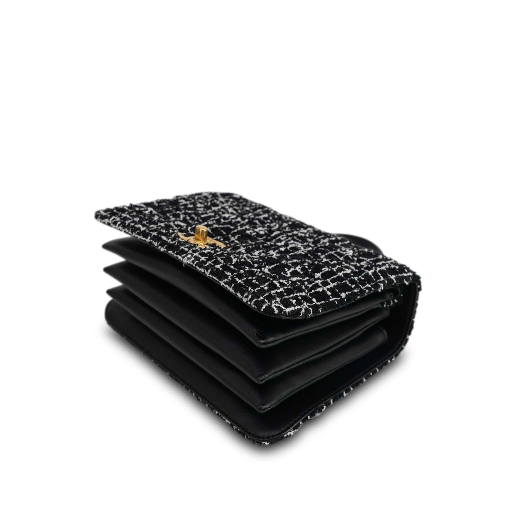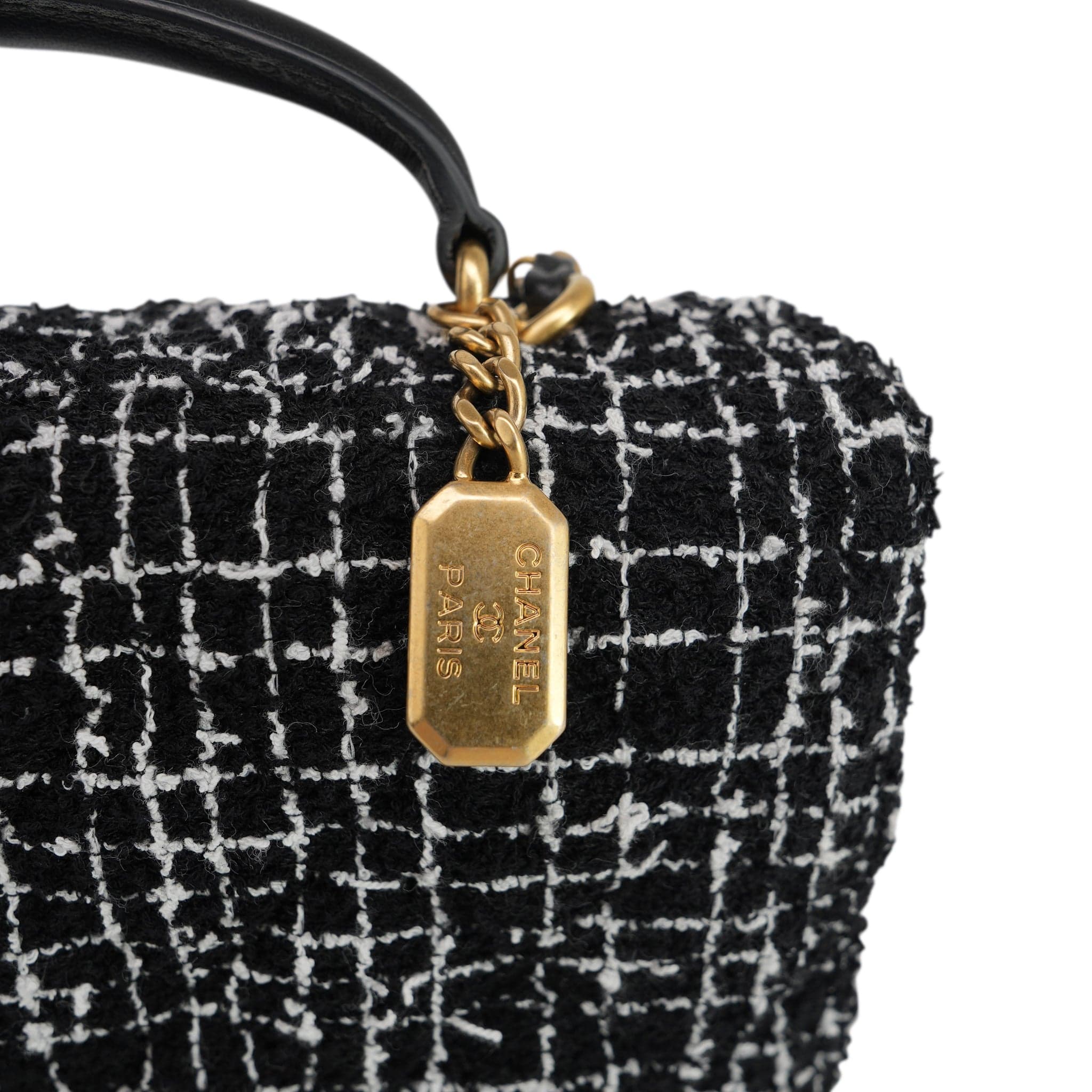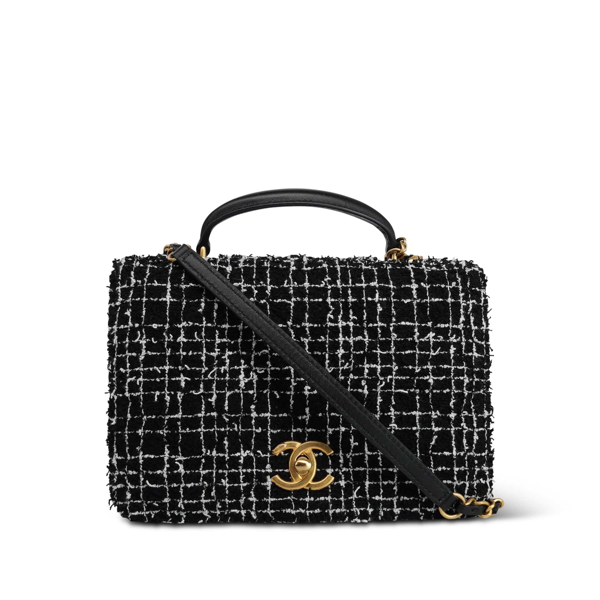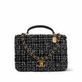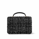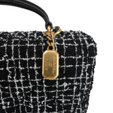 Black White Tweed Quilted Top Handle Full Flap Aged Gold Hardware