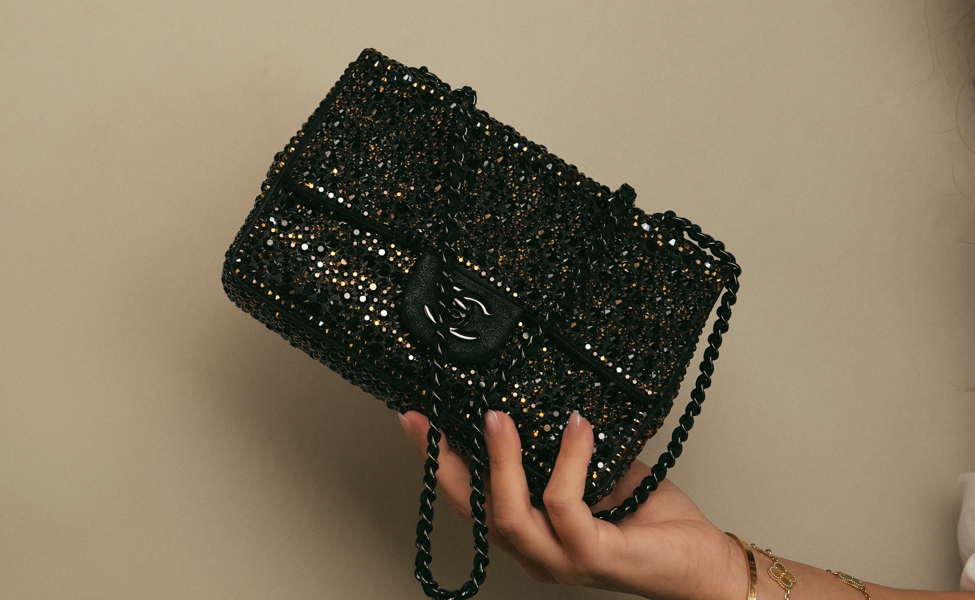 Condition: Excellent. Light scratches on hardware. Minor impressions on flap from crystals.