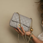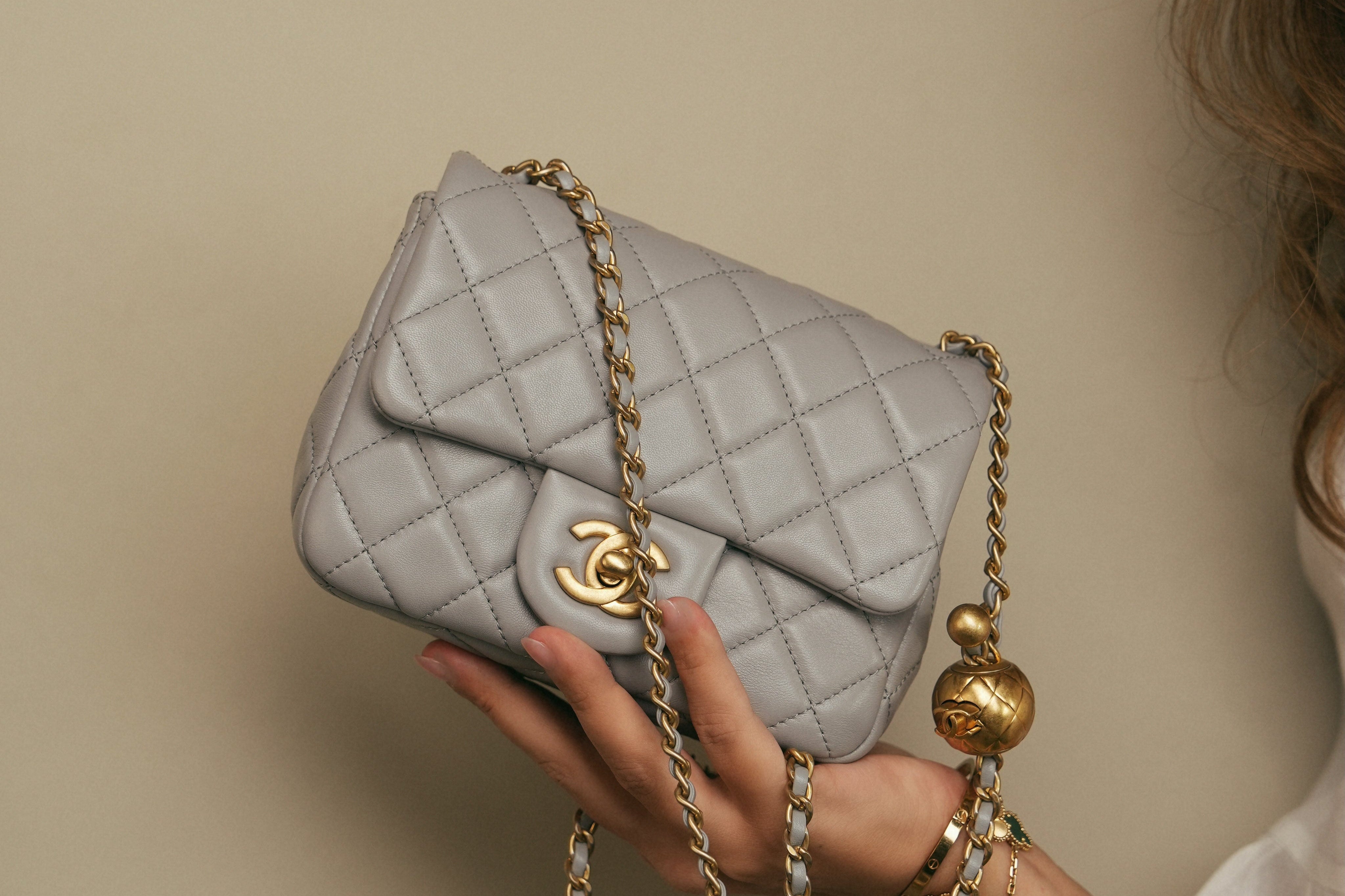 Grey Lambskin Quilted Pearl Crush Mini Square Flap Aged Gold Hardware