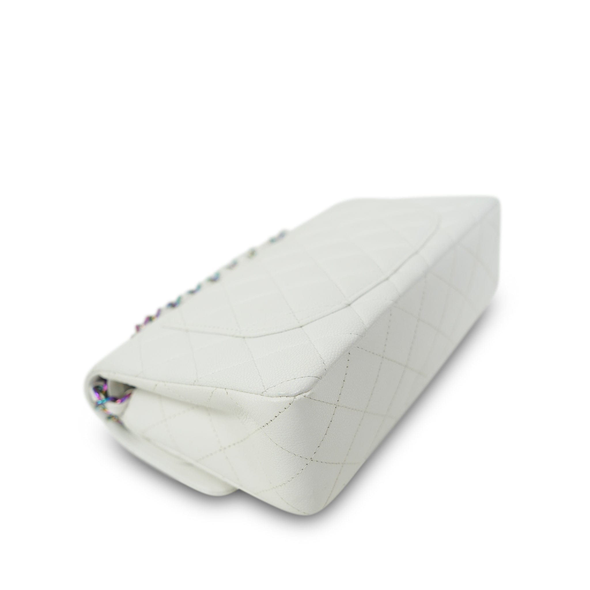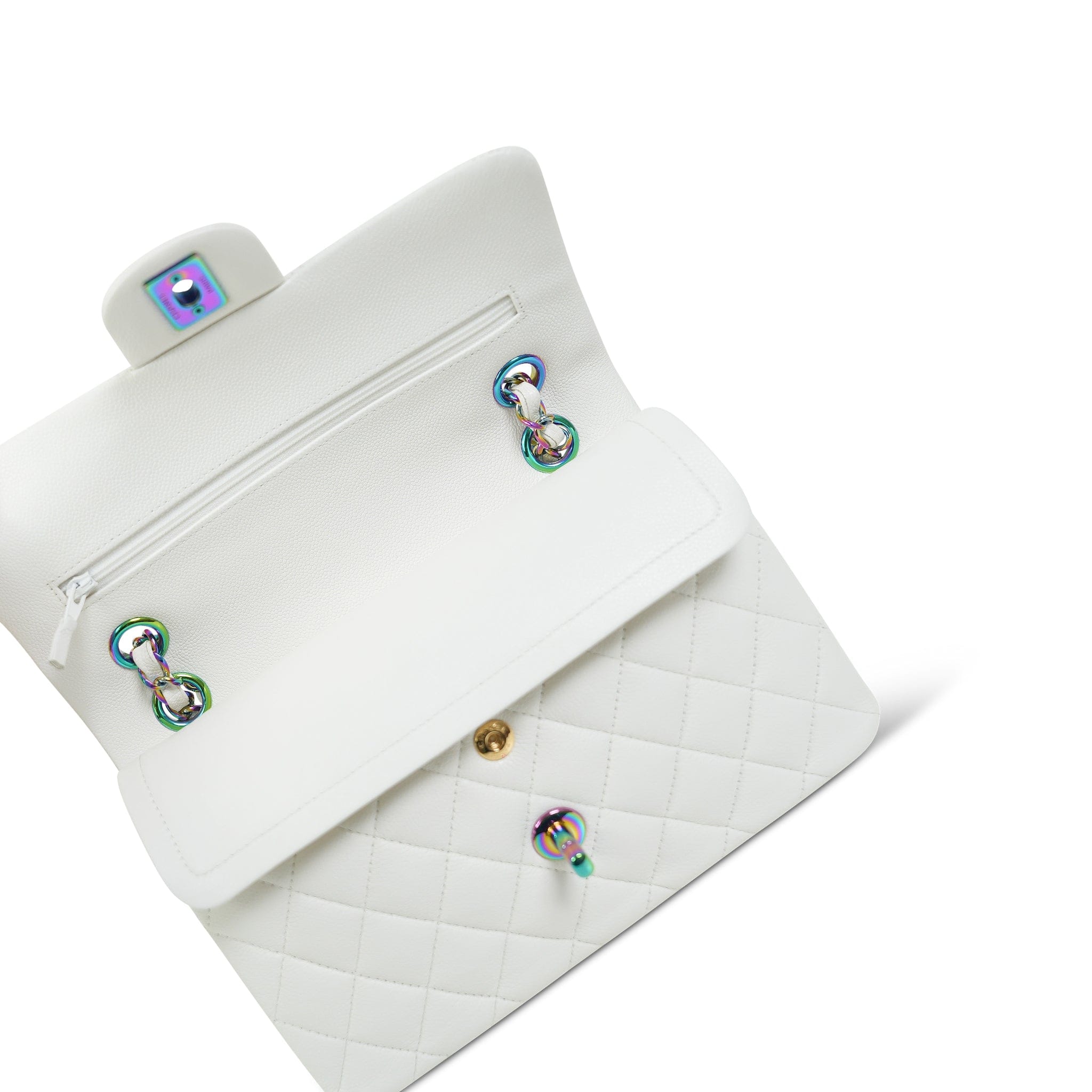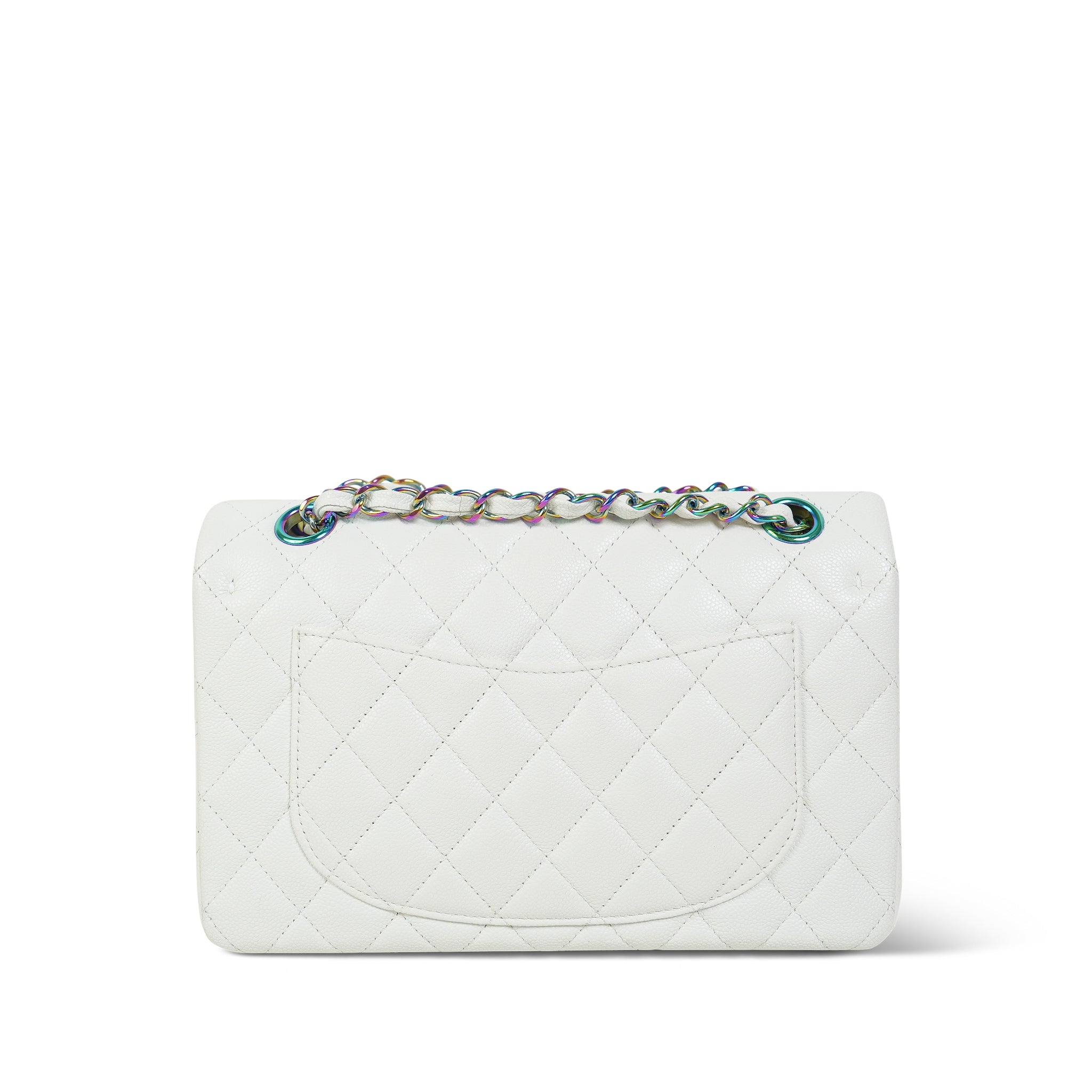 White Caviar Quilted Classic Flap Small Rainbow Hardware